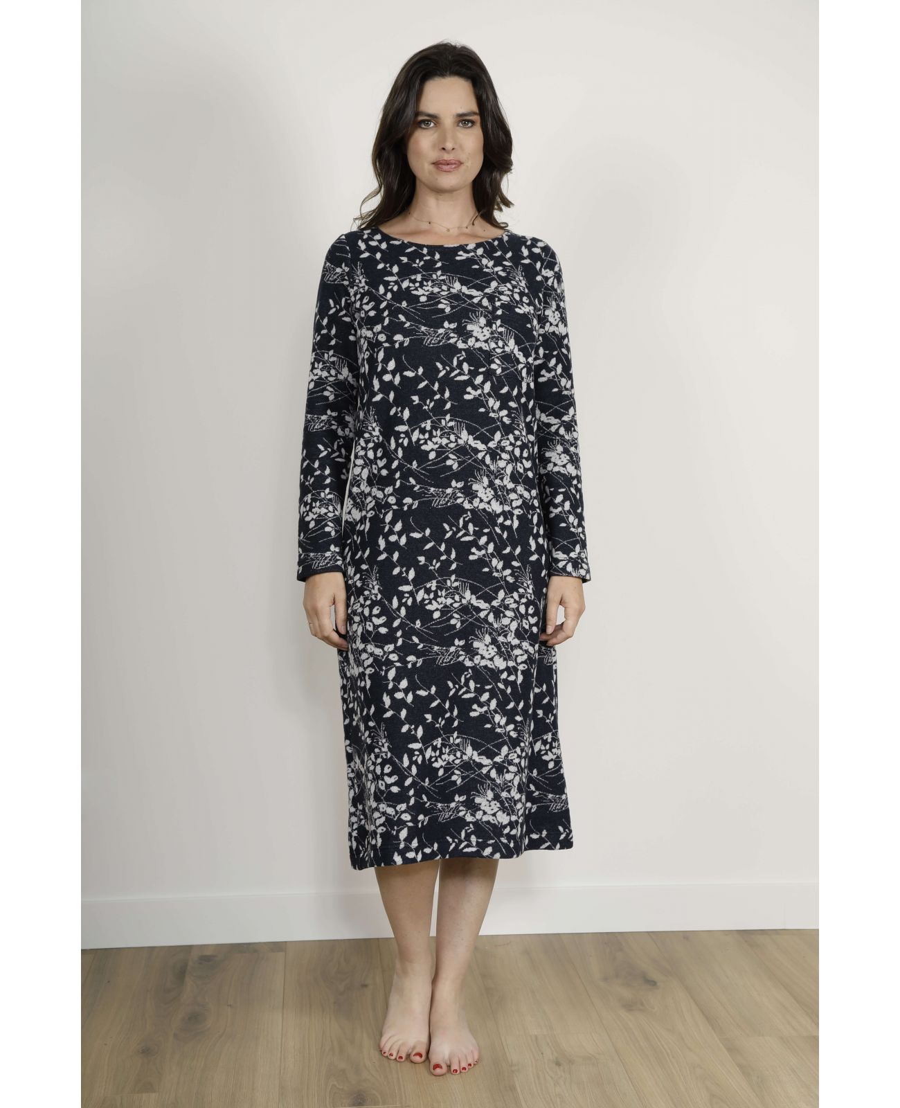 L’alliance entre fonctionnalité et élégance s’exprime dans chaque détail : finitions soignées, design sobre et lignes épurées. Les poches supérieures, cousues avec discrétion, restent utiles sans rompre l’harmonie visuelle de la chemise de nuit femme. L’imprimé feuillages ajoute une note naturelle très tendance, parfaitement mise en valeur par la teinte bleu marine.