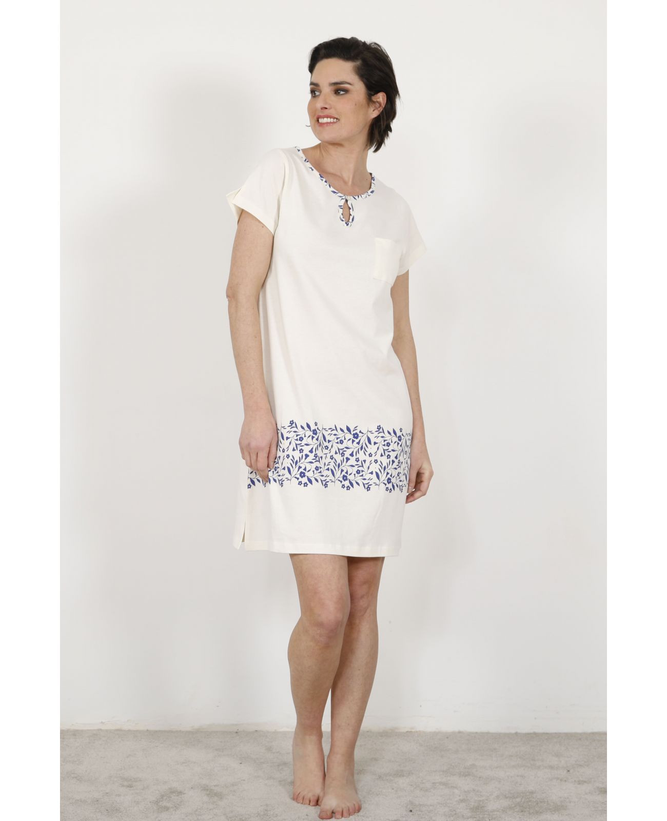 Ce qui rend la chemise de nuit femme Zophia blanc écru absolument unique dans la collection, c'est sa conception en placement imprimé. Plutôt que de couvrir uniformément le tissu comme sur la version bleu marine de la collection, l'imprimé botanique est ici concentré avec précision : une bordure florale bleu marine court tout autour de l'ourlet, créant une frise végétale décorative qui encadre le bas de la chemise avec une sophistication remarquable. Le même imprimé réapparaît en liseré sur l'encolure ronde, créant un dialogue visuel entre le haut et le bas de la pièce d'une cohérence parfaite. Au centre de l'encolure, une petite découpe en goutte avec lien à nouer apporte une touche de sensualité douce et maîtrisée — détail couture élégant qui distingue immédiatement la Zophia écru de toute autre chemise de nuit basique. Une poche poitrine discrète et les manches courtes tombantes complètent la pièce avec une fonctionnalité élégante.