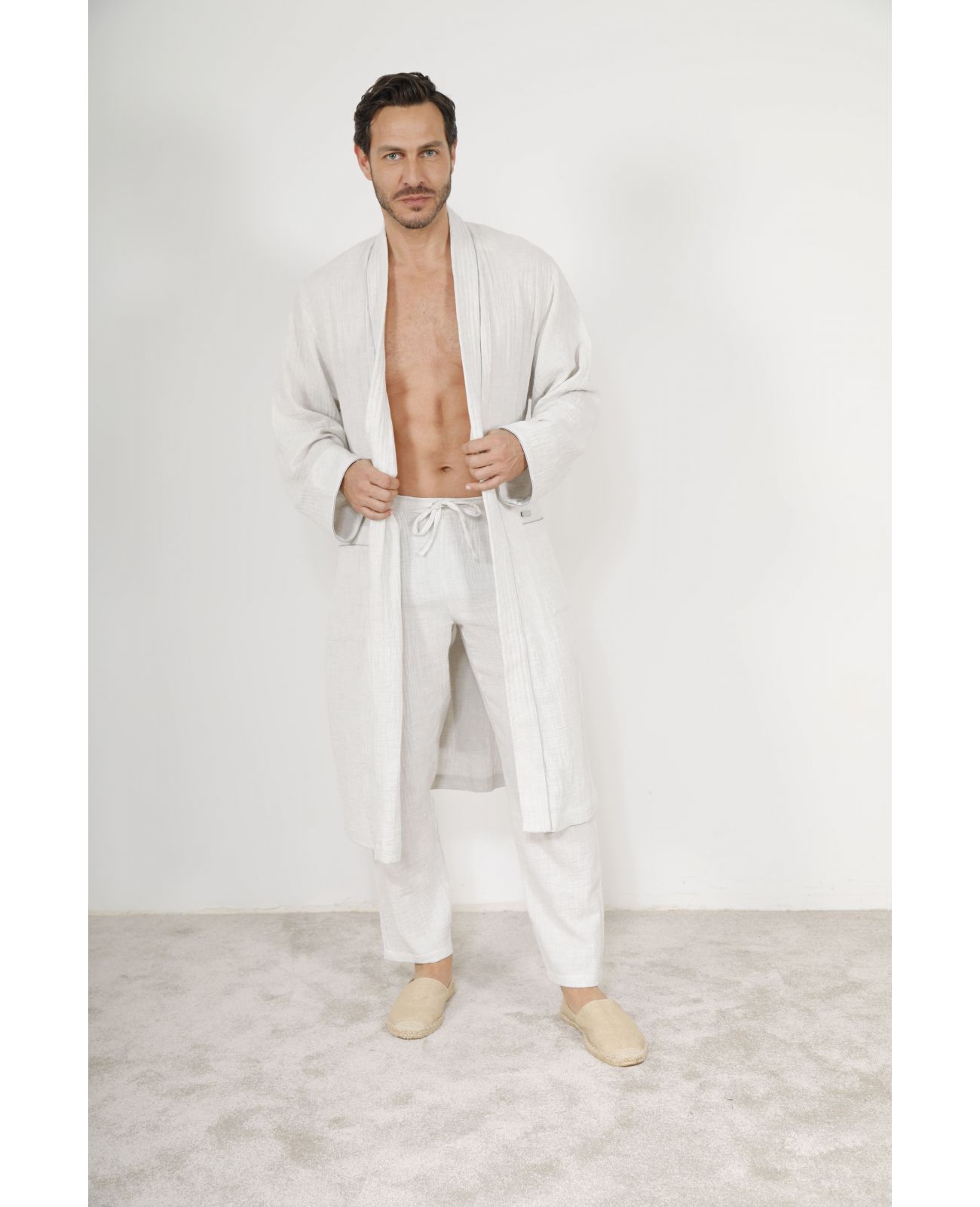 La teinte beige naturel du kimono long VASCO est l'expression authentique de la couleur propre au coton organique brut, à peine sublimée. Cette nuance douce et lumineuse, que la photo restitue avec une fidélité remarquable, évoque instantanément la sérénité des intérieurs épurés, la douceur du sable fin et l'élégance des matières vivantes. Une palette chromatique intemporelle qui s'accorde avec toutes les morphologies et tous les environnements, du boudoir au patio ensoleillé.