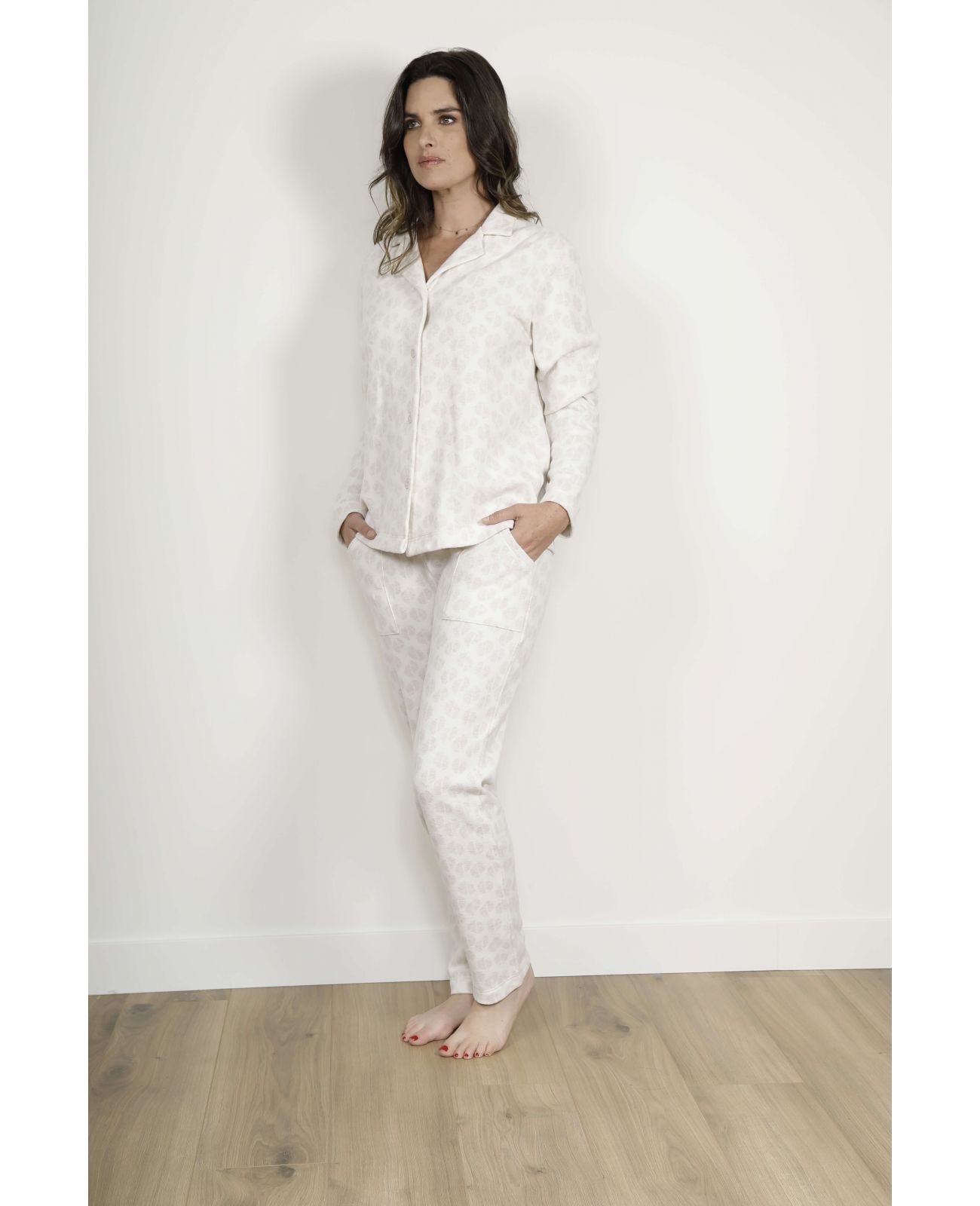 La coupe du pyjama Susane met l'accent sur le bien-être et la liberté de mouvement. La veste boutonnée présente une forme droite qui descend délicatement sur les hanches sans serrer. Le col tailleur/cranté rappelle celui des chemises traditionnelles, conférant une élégance subtile même en tenue de nuit.