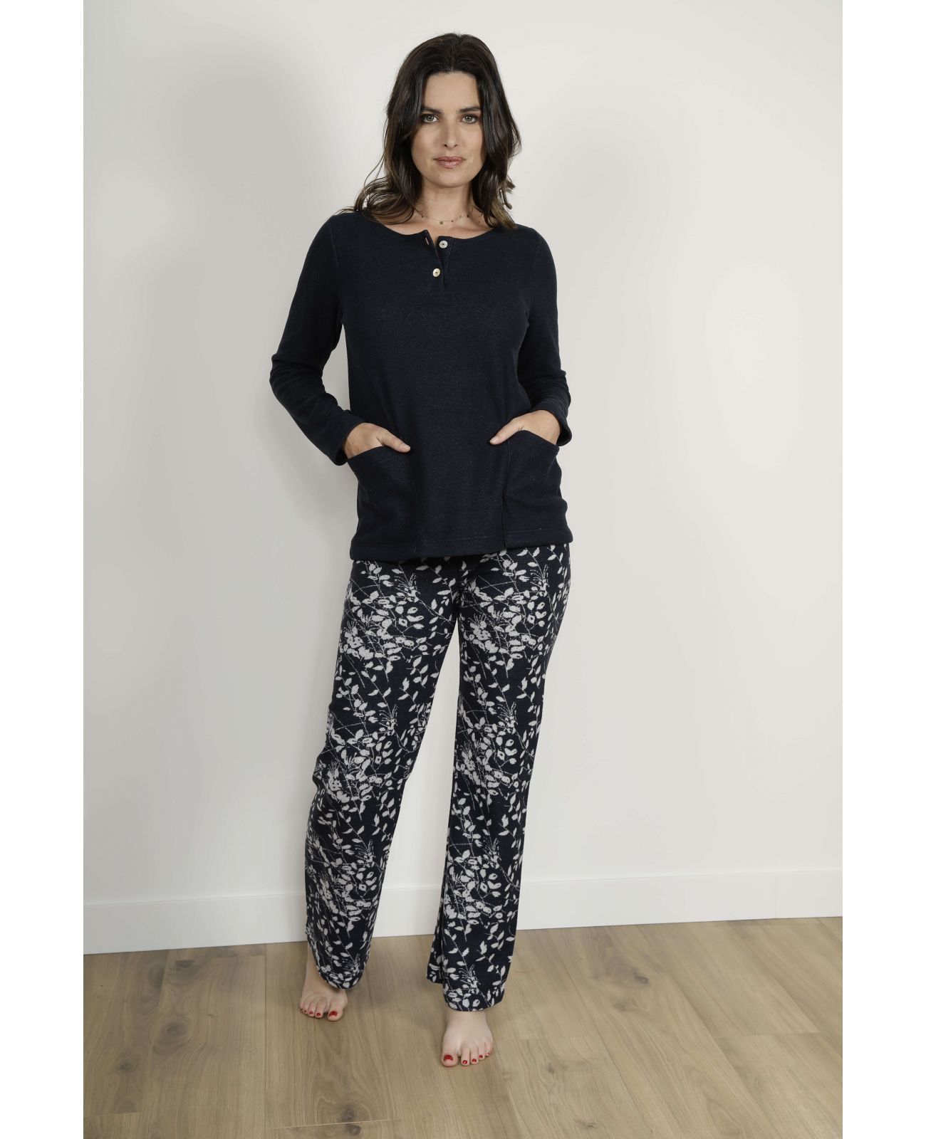 La combinaison du molleton uni sur le haut et du bas en jersey molleton feuillage distingue ce pyjama long. La texture légèrement épaisse retient la chaleur, mais reste légère pour éviter toute gêne. Chaque soirée devient ainsi synonyme de détente absolue, sans inconfort ni lourdeur.