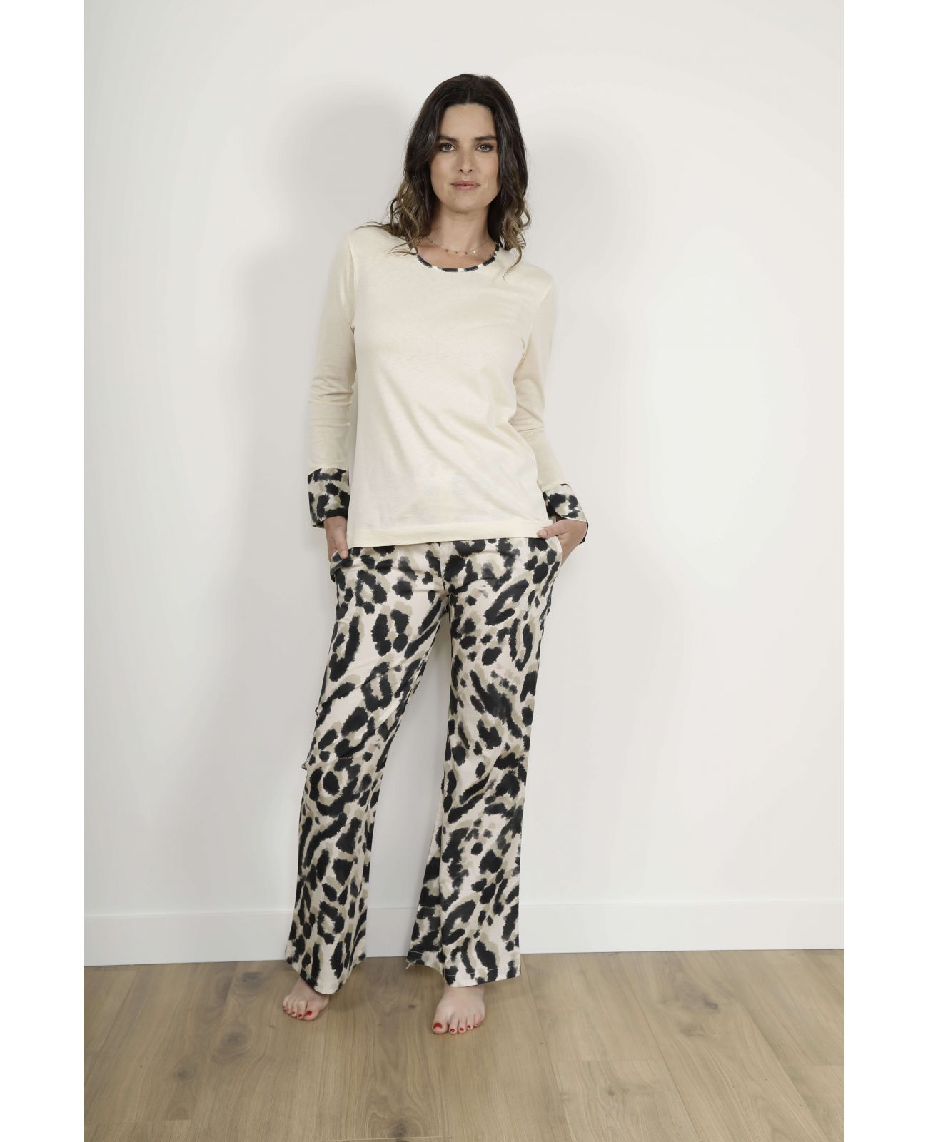Côté style, le col rond offre une ligne douce autour du visage, tandis que l’imprimé peau de bête contraste subtilement avec la sobriété du beige. Cela donne une touche moderne à la tenue de nuit, tout en conservant sa simplicité intemporelle. Les coutures renforcées assurent la robustesse du pyjama et préservent sa beauté lavage après lavage.