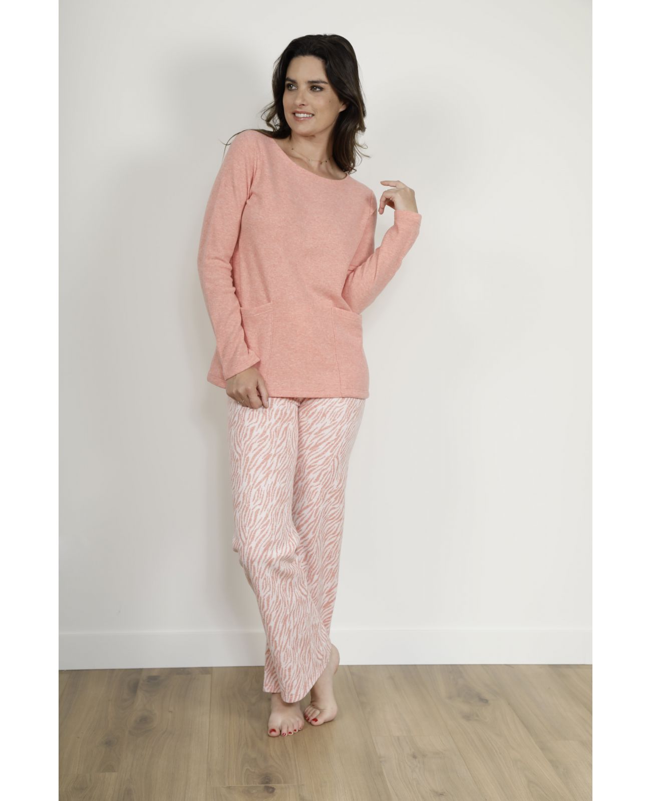 Le design du pyjama long femme Pavie mise sur l’originalité grâce à ses motifs zébrés intégrés au tissu uni corail. Les imprimés animaliers traversent les tendances et apportent toujours une note dynamique à toute garde-robe, même pour le homewear.