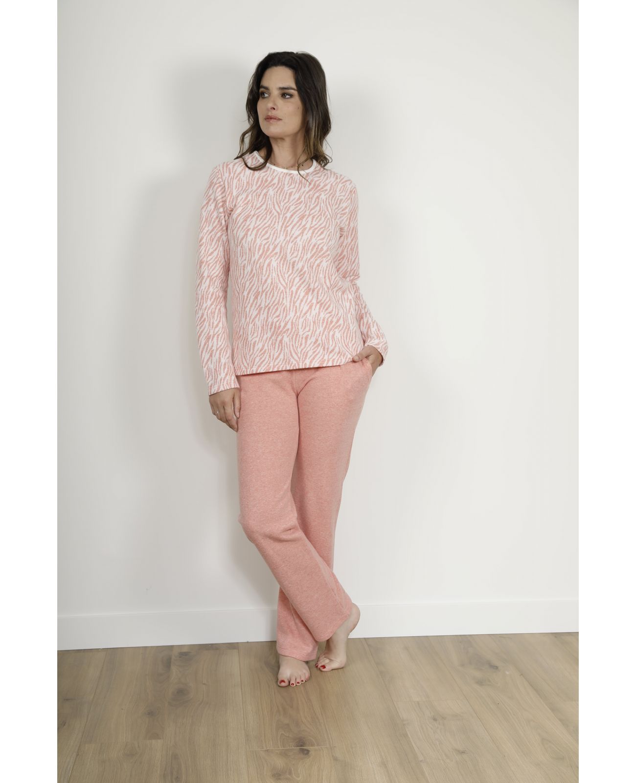 Le jersey molletonné se distingue par sa texture douce, extensible et particulièrement agréable à porter. Idéal pour un pyjama long femme, il offre une liberté de mouvement essentielle pour passer des nuits paisibles ou savourer des instants de détente devant un film.