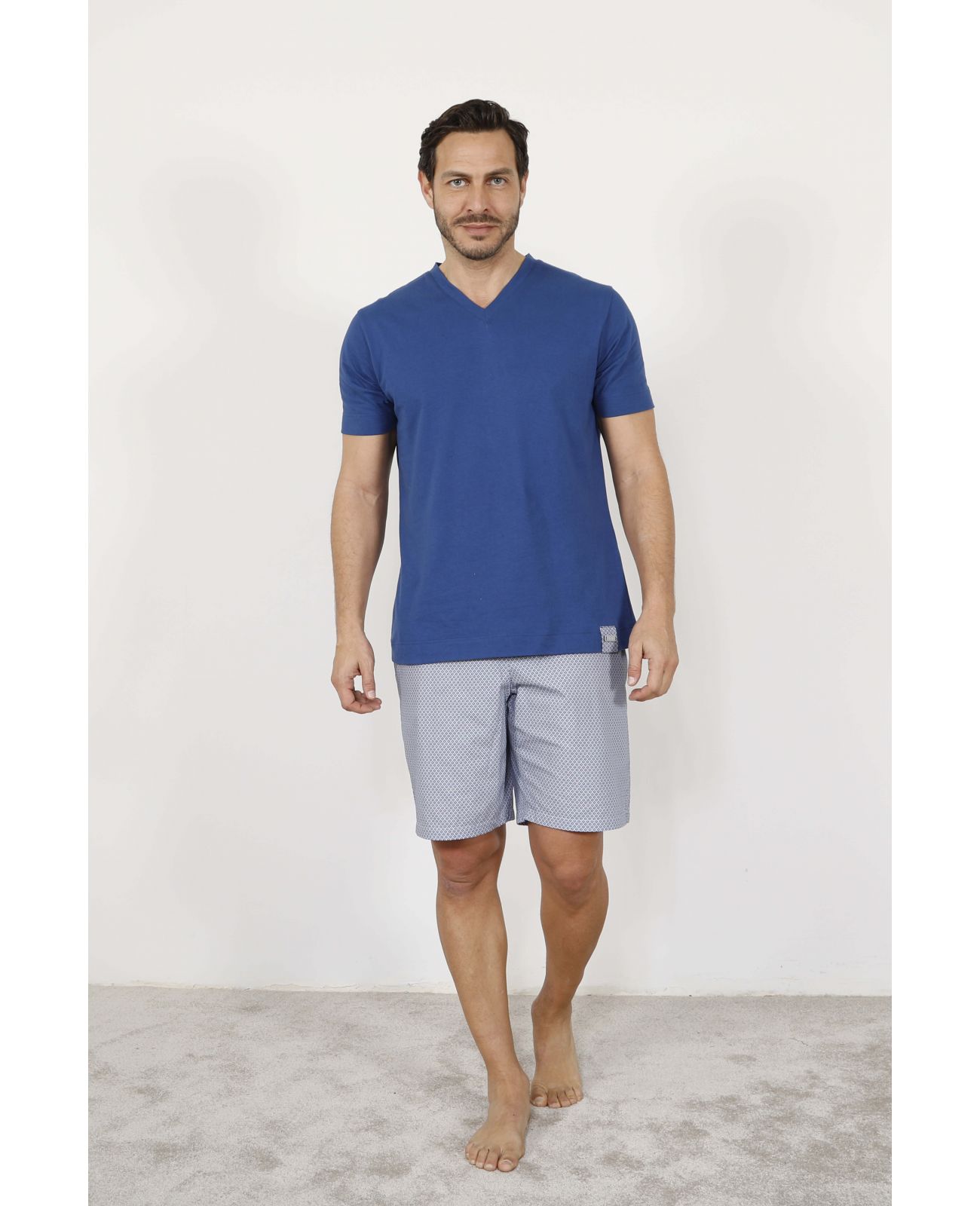 Le pyjama court homme VASSILI de la maison PILUS sublime vos nuits grâce à un duo raffiné : un t-shirt en jersey uni indigo à col V et un short en popeline de coton motif cravate marine. Entièrement réalisé en 100% coton, il offre une douceur incomparable et une respirabilité naturelle pour un confort absolu.