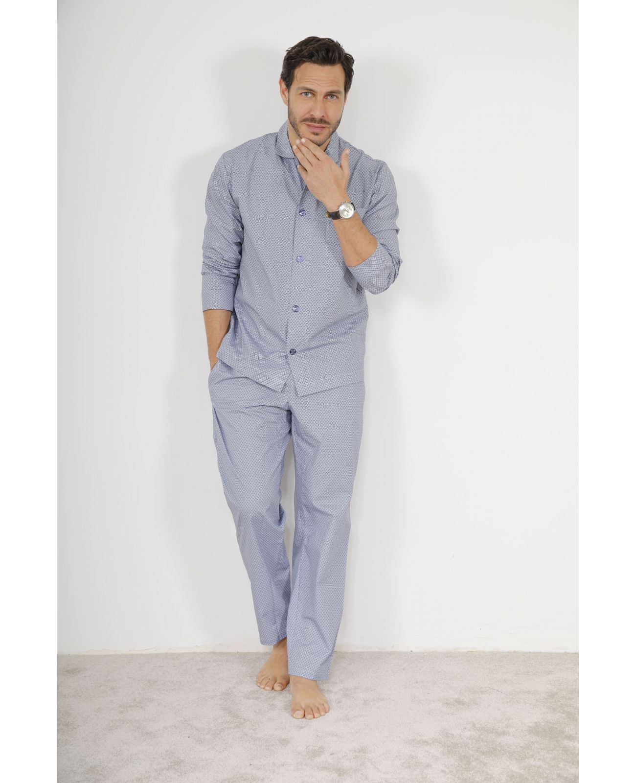 Le pyjama tailleur homme VASSILI de la Maison PILUS incarne une vision contemporaine et raffinée de la nuit. Façonné dans une popeline de coton pur, ornée d'un discret motif dessin cravate, ce pyjama tailleur homme boutonné allie l'élégance d'une coupe structurée à la douceur enveloppante d'une matière d'exception. Bleu marine profond, teinte intemporelle et distinguée, il s'impose comme la pièce maîtresse d'une garde-robe nocturne véritablement haut de gamme.