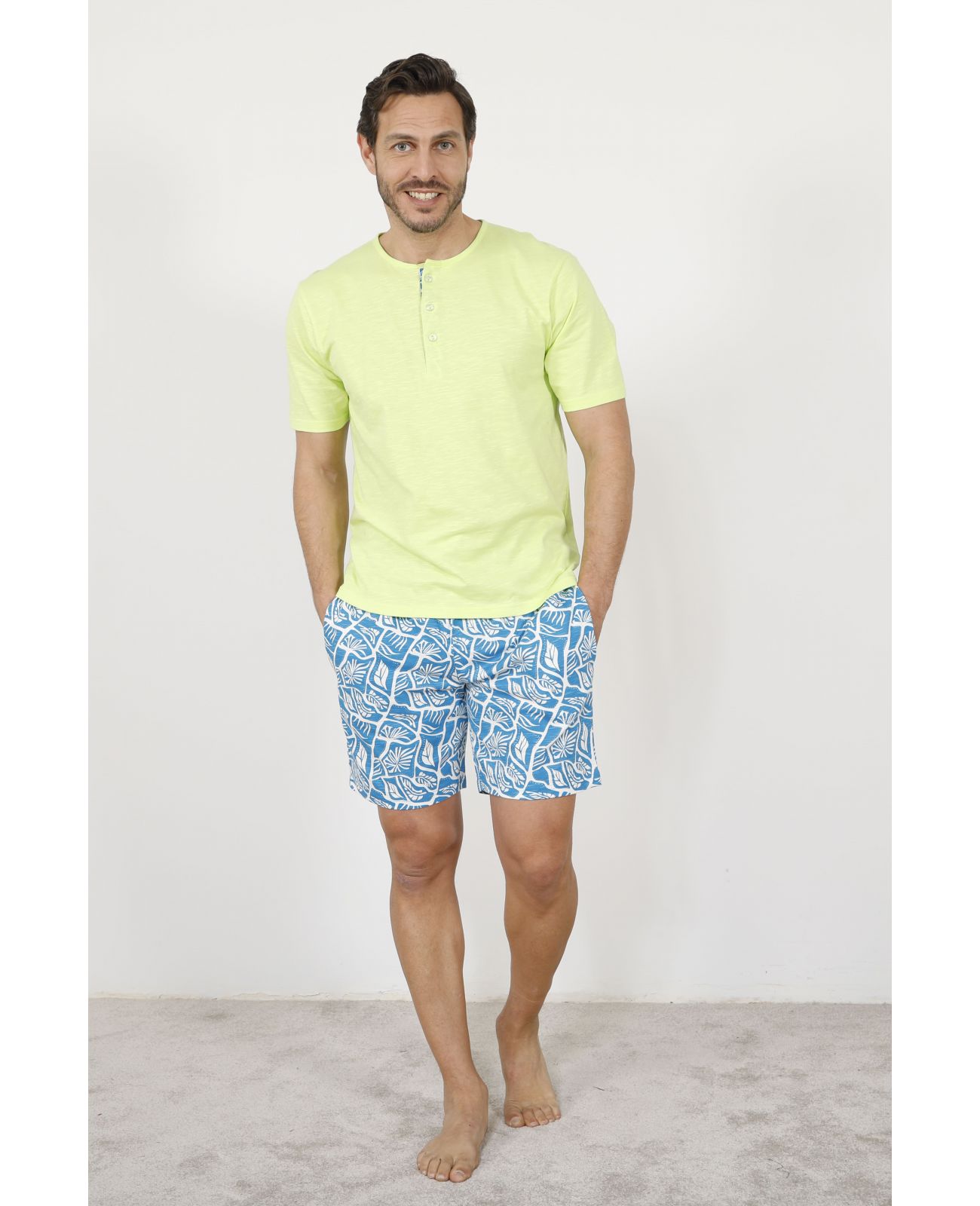 Pyjama court homme YORICK en 100% coton, douceur et respirabilité optimales. Tee-shirt bleu dur élégant, col travaillé. Short imprimé assorti, style estival raffiné. Signature christian cane, qualité et confort durables.