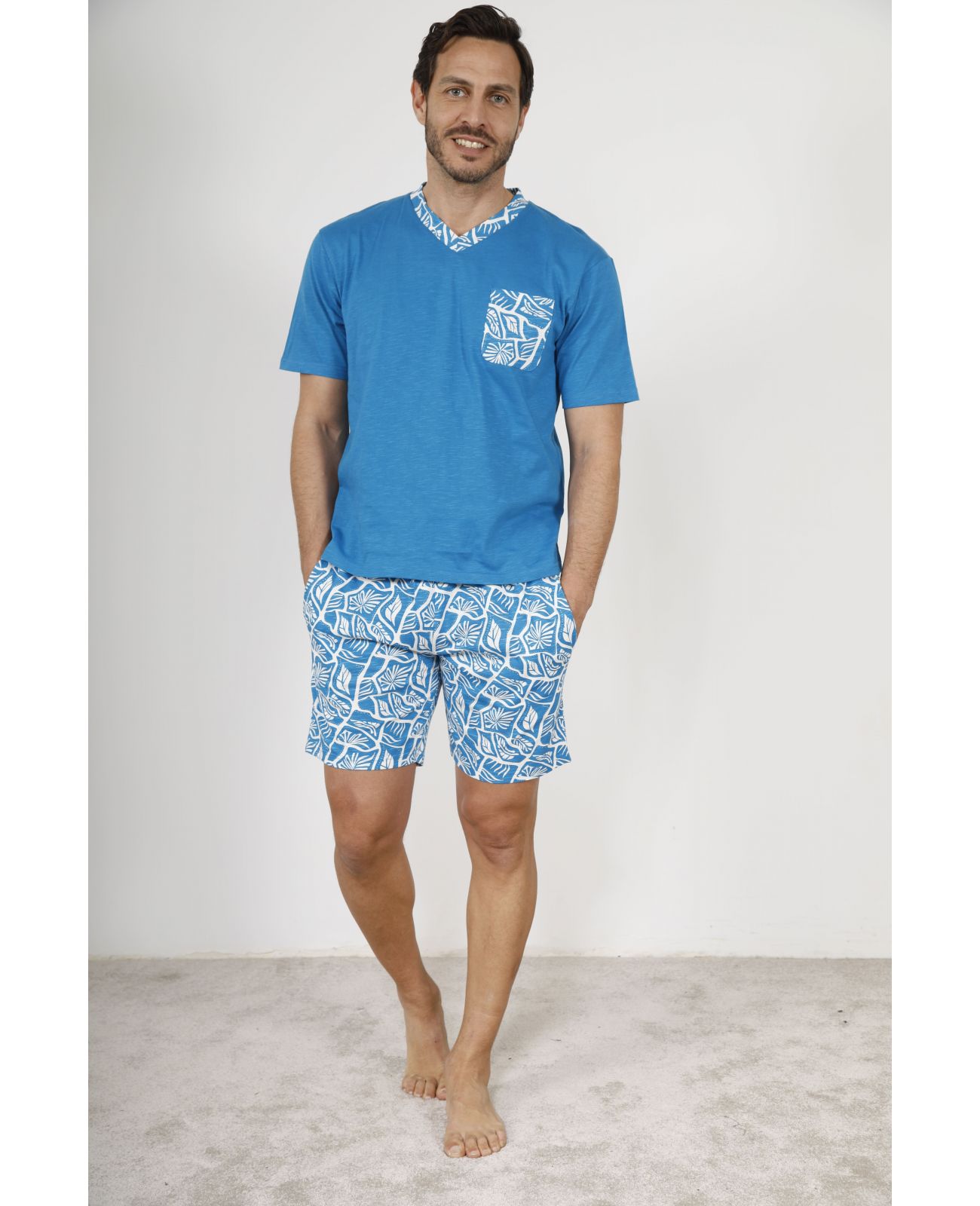 Le pyjama court homme YORICK se distingue par son coloris bleu dur profond, à la fois masculin et intemporel. Le tee-shirt arbore un col en V et une poche poitrine animés par un imprimé graphique rappelé sur le short, créant un ensemble harmonieux au style affirmé. Ce jeu de contrastes entre uni et motif apporte une touche contemporaine tout en préservant une élégance discrète, parfaitement adaptée à un vestiaire d’intérieur premium.