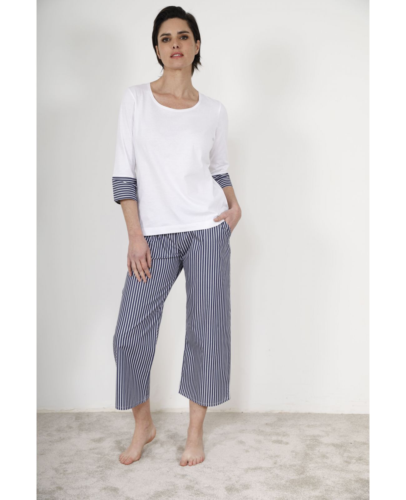 Le pyjama court femme Withney tire sa singularité de l'association audacieuse et réussie de deux matières complémentaires. Le haut en jersey uni blanc, doté d'un col rond épuré et de manches trois-quarts finies d'un revers en popeline rayée marine, dévoile un détail couture aussi discret qu'élégant. Ce clin d'œil graphique fait écho au bas en popeline rayée marine et blanc, créant une cohérence esthétique soignée qui distingue immédiatement le Withney des pyjamas ordinaires. La coupe du pantalon, longueur corsaire fluide, apporte une légèreté visuelle et une liberté de mouvement que l'on apprécie tout au long de la nuit.