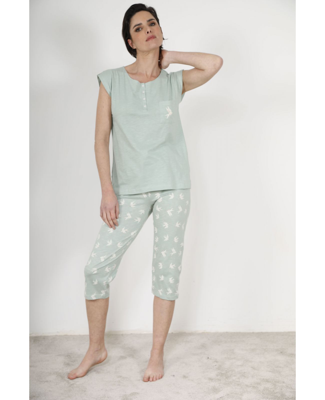 Le pyjama court femme Zaelle tire sa singularité de la rencontre réussie entre deux pièces aux caractères complémentaires. Le haut en jersey uni vert amande adopte une coupe sans manches d'une liberté absolue, avec des emmanchures structurées qui garantissent une tenue irréprochable sans jamais contraindre. Une ouverture boutonnée au col, discrète et raffinée, crée une ouverture élégante qui facilite l'enfilage tout en apportant un détail couture bienvenu. La poche poitrine, ornée d'une hirondelle blanche solitaire en vol, crée le lien visuel subtil et poétique avec le corsaire imprimé. Ce dernier, en jersey imprimé hirondelles blanches sur fond vert amande, déploie ses motifs avec une générosité harmonieuse qui donne au bas du pyjama une personnalité immédiatement séduisante. La longueur trois-quarts du corsaire dégage les mollets avec légèreté tout en offrant une couverture confortable pour toutes les nuits estivales.
