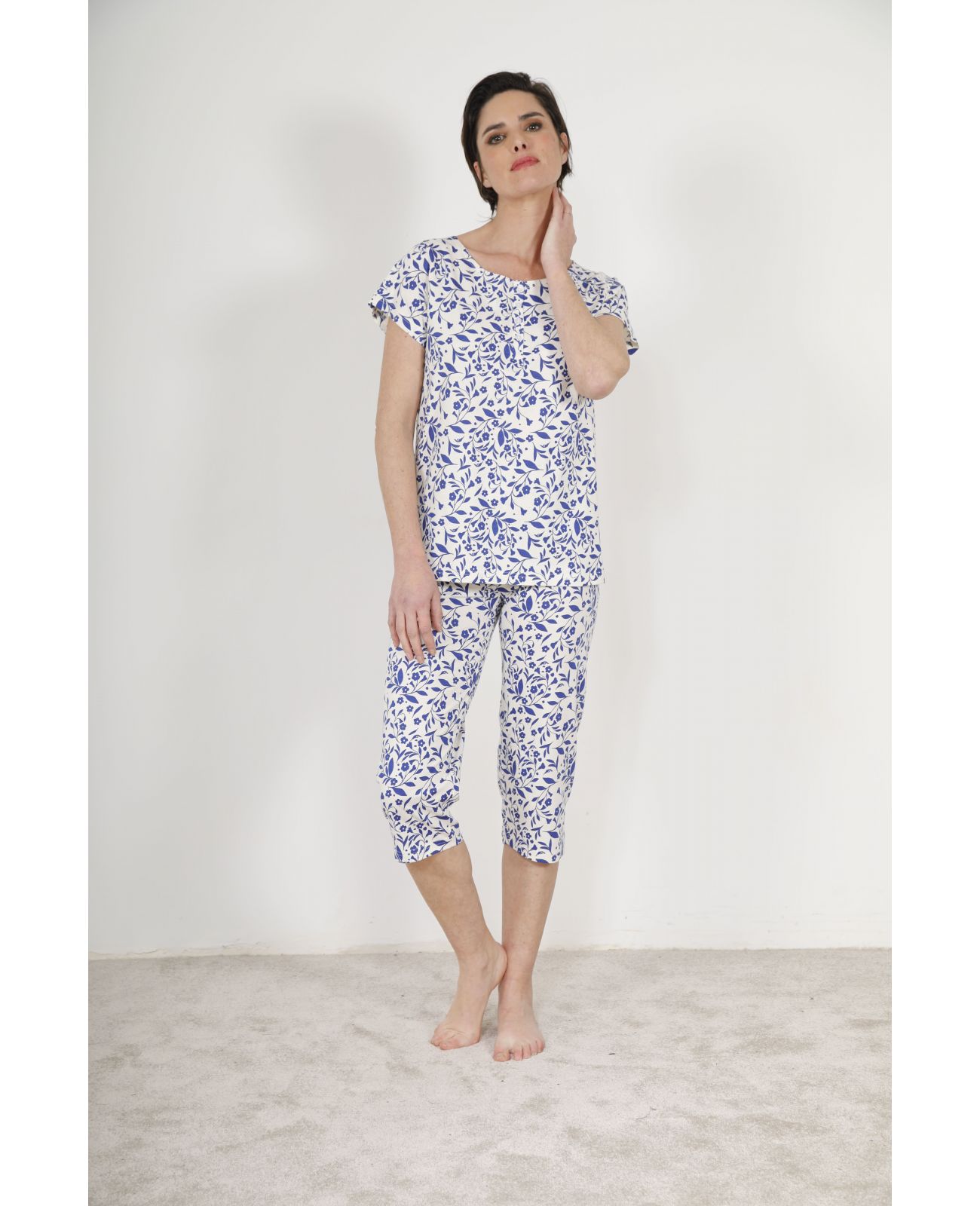 Habituez vos nuits à l'élégance graphique du pyjama court femme Zophia, une création Christian Cane qui porte le motif botanique à son expression la plus raffinée. Sur fond blanc immaculé, un réseau dense de feuillages, tiges et petites fleurs bleu marine recouvre généreusement le haut et le corsaire dans une harmonie visuelle totale et saisissante. Ce pyjama court femme deux pièces est une déclaration d'élégance nocturne accessible — riche, cohérente et immédiatement reconnaissable.