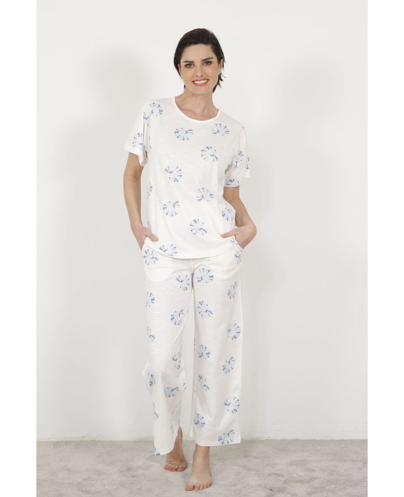 Ce qui distingue immédiatement l'ensemble court d'été femme Zabou, c'est la générosité de son imprimé. Ces grandes fleurs stylisées bleu ciel, éparpillées avec une désinvolture calculée sur le fond écru, créent un dialogue chromatique doux et lumineux qui évoque les jardins de juillet et la légèreté des après-midis d'été. Le motif, ni trop dense ni trop rare, occupe l'espace du tissu avec une équilibre visuel parfait qui flatte la silhouette tout en l'animant d'une vie joyeuse. Le haut et le pantalon partagent le même imprimé, créant une harmonie totale de l'ensemble qui renforce son impact visuel et son élégance naturelle.