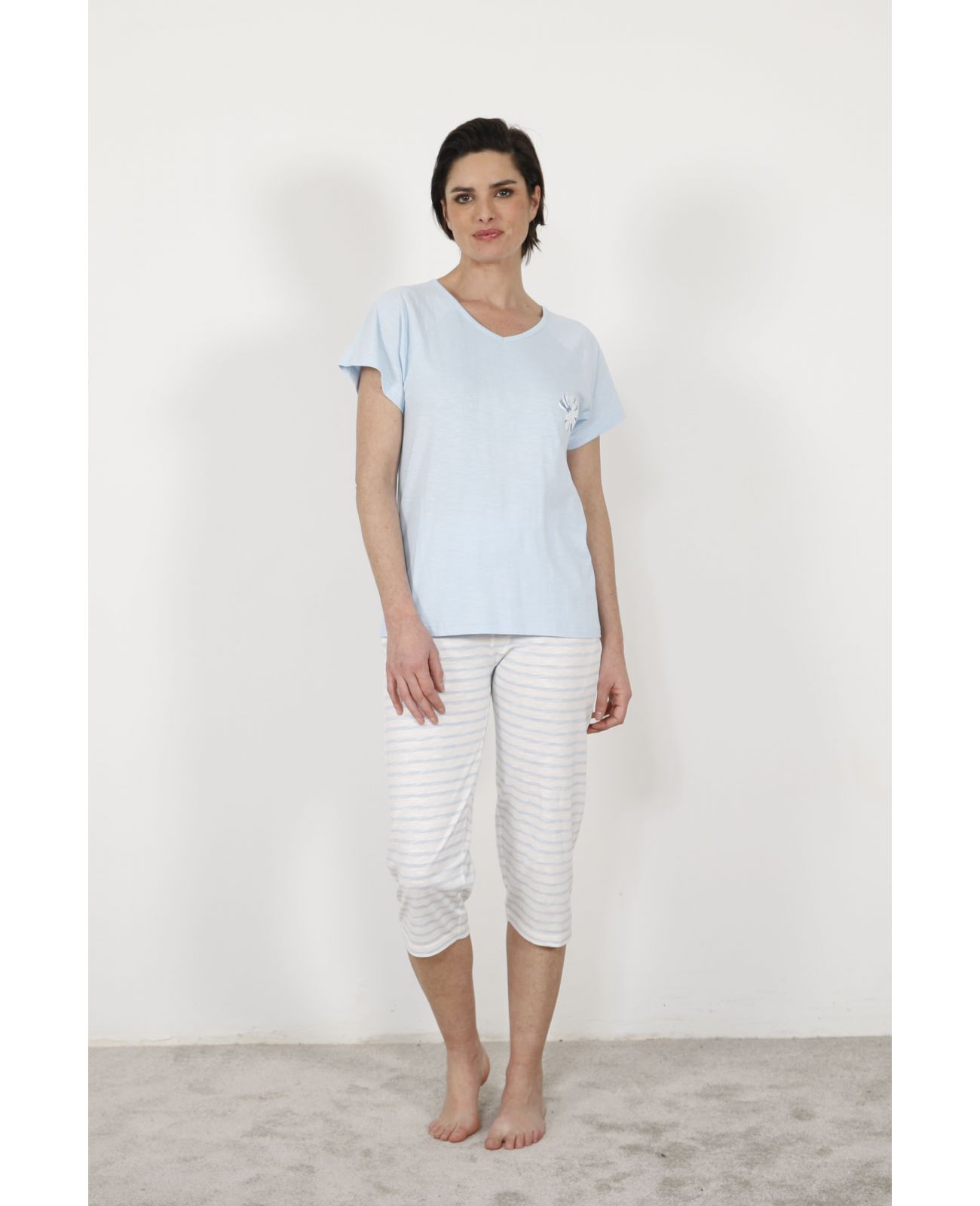 L'ensemble court d'été femme Zaz tire sa personnalité de la rencontre réussie entre deux pièces aux caractères distincts et complémentaires. Le haut en jersey uni bleu ciel adopte un col V élégamment ouvert qui encadre l'encolure avec une féminité naturelle. Sa coupe légèrement oversize et ses manches courtes tombantes lui confèrent cette allure décontractée que l'on apprécie tant lors des journées estivales. Sur la poitrine, un motif floral blanc discret apporte une note graphique douce qui crée un lien subtil avec l'esprit de la collection. Le corsaire rayé ciel et blanc, longueur trois-quarts, dégage les mollets avec légèreté tout en offrant une couverture confortable pour toutes les activités de la belle saison. Sa ceinture élastiquée assure un maintien bienveillant qui s'adapte à toutes les morphologies sans jamais contraindre.