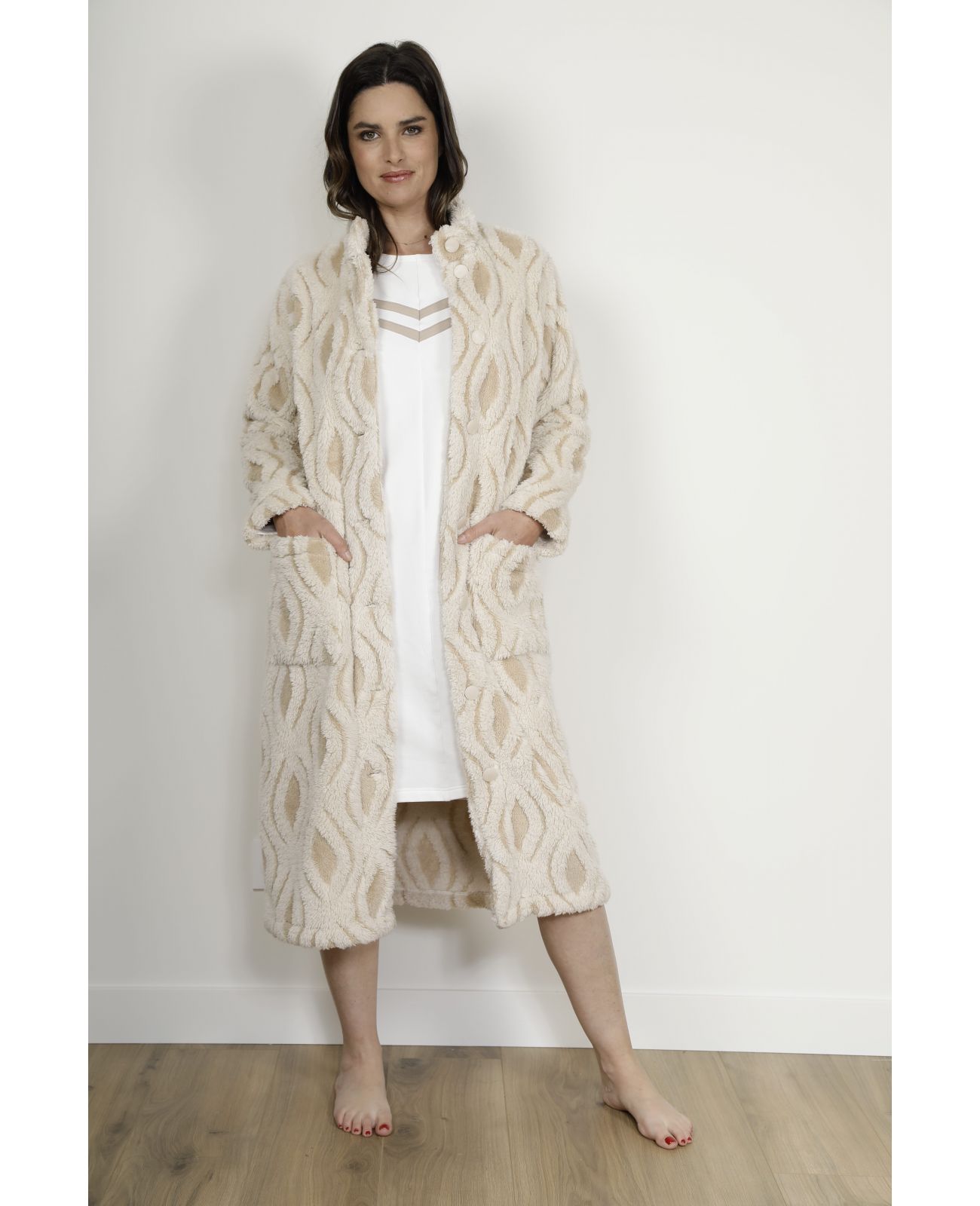 Avec son col montant , sa fermeture boutonnée et ses poches hautes , la robe de chambre Pakita coche toutes les cases pour devenir votre alliée préférée lors des journées à la maison. Son tissu chaud en polaire moutonné et son coloris beige facile à porter accompagnent chaque instant de détente avec élégance.