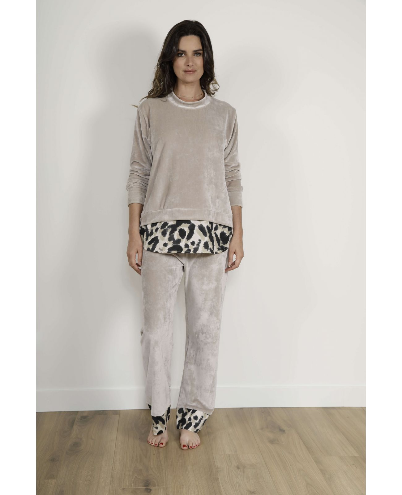 Pour sortir du lot, la tenue d’intérieur femme Soline mise sur un imprimé fantaisie animalier. Ce motif apporte énergie et dynamisme, mais reste équilibré grâce à une palette de couleurs dominée par le beige. Cette nuance délicate ajoute chaleur et luminosité, créant une atmosphère enveloppante et apaisante.